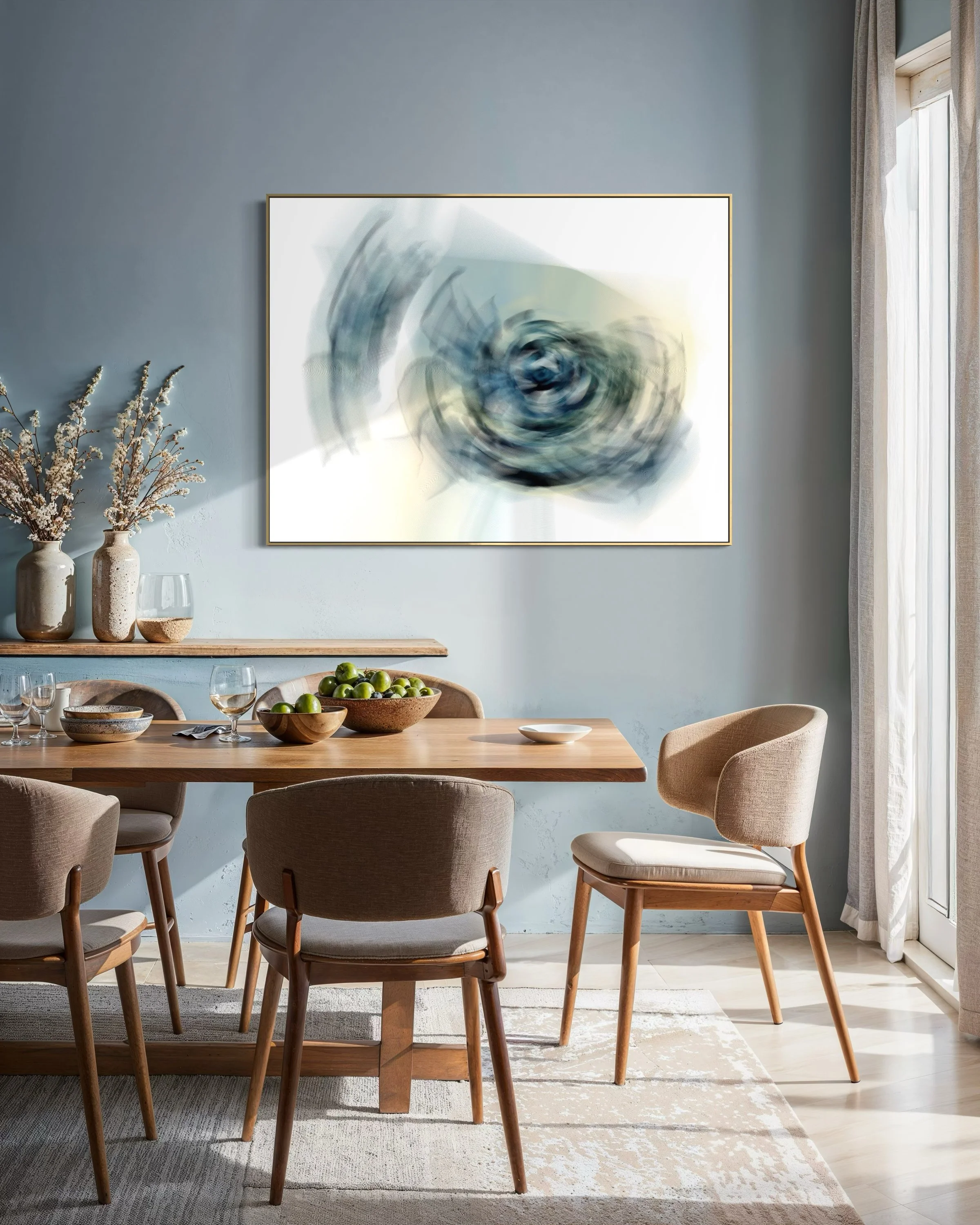 Entwined drifts like a quiet current, where soft swirls and blurred hues weave a delicate tapestry of light and shadow. The forms fold and fold again, creating a calm vortex that feels suspended in time. There is a gentle stillness within the motion, a meditative rhythm that invites the viewer to pause, reflect, and become aware of the fleeting beauty held within each subtle shift.